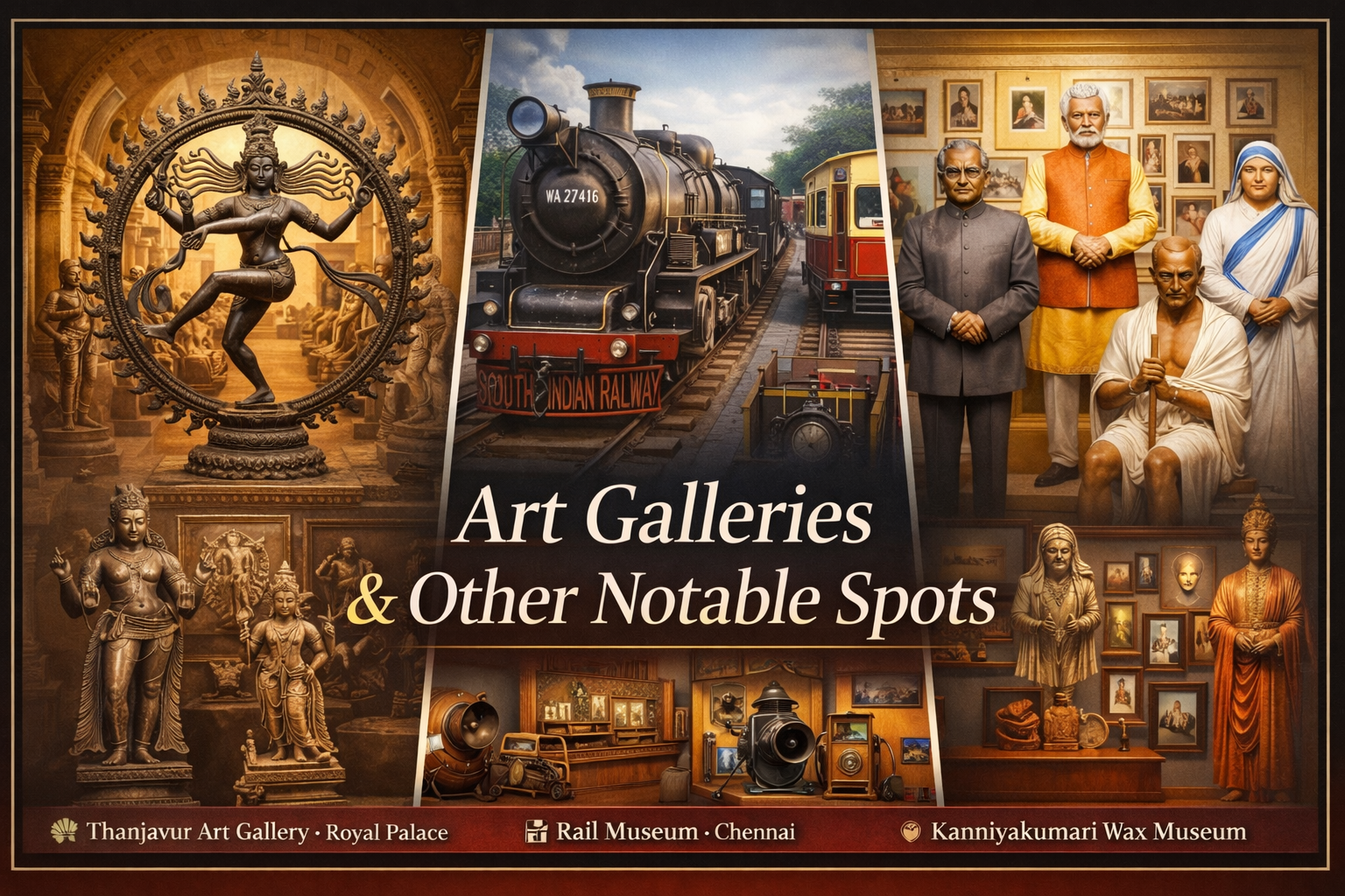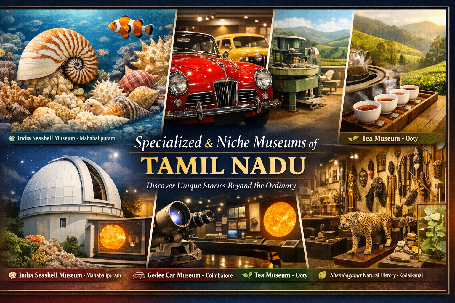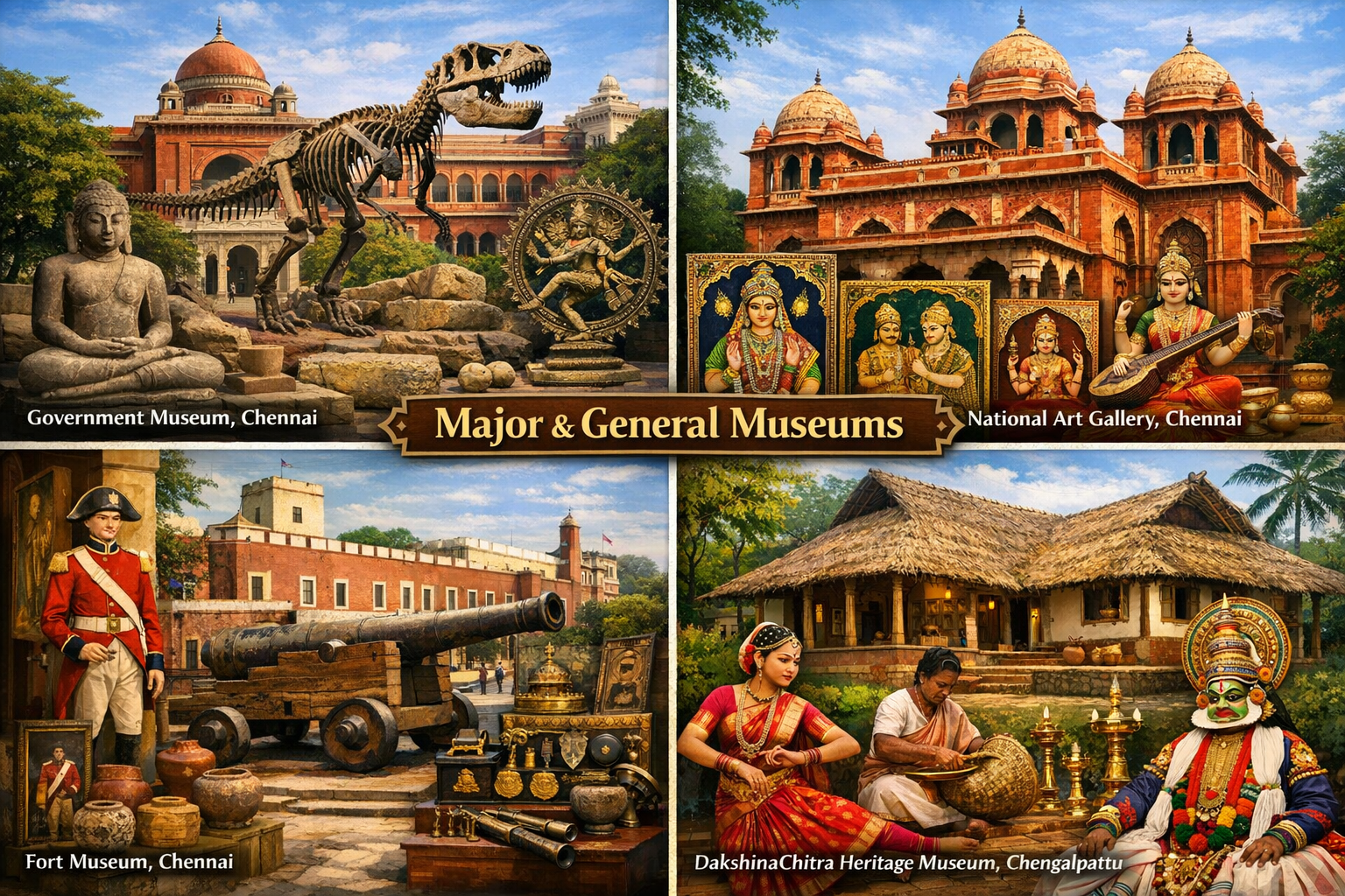 Tamil Nadu boasts a rich collection of museums and galleries, from major institutions like the Government Museum, Chennai, and National Art Gallery (Chennai) to specialized spots such as the India Seashell Museum (Mahabalipuram), Gedee Car Museum (Coimbatore), Tea Museum (Ooty), and historic sites like DakshinaChitra, showcasing diverse art, history, culture, natural history, and science for all ages. Key art hubs include the Thanjavur Art Gallery, while significant memorials like APJ Abdul Kalam House offer poignant insights into leaders.